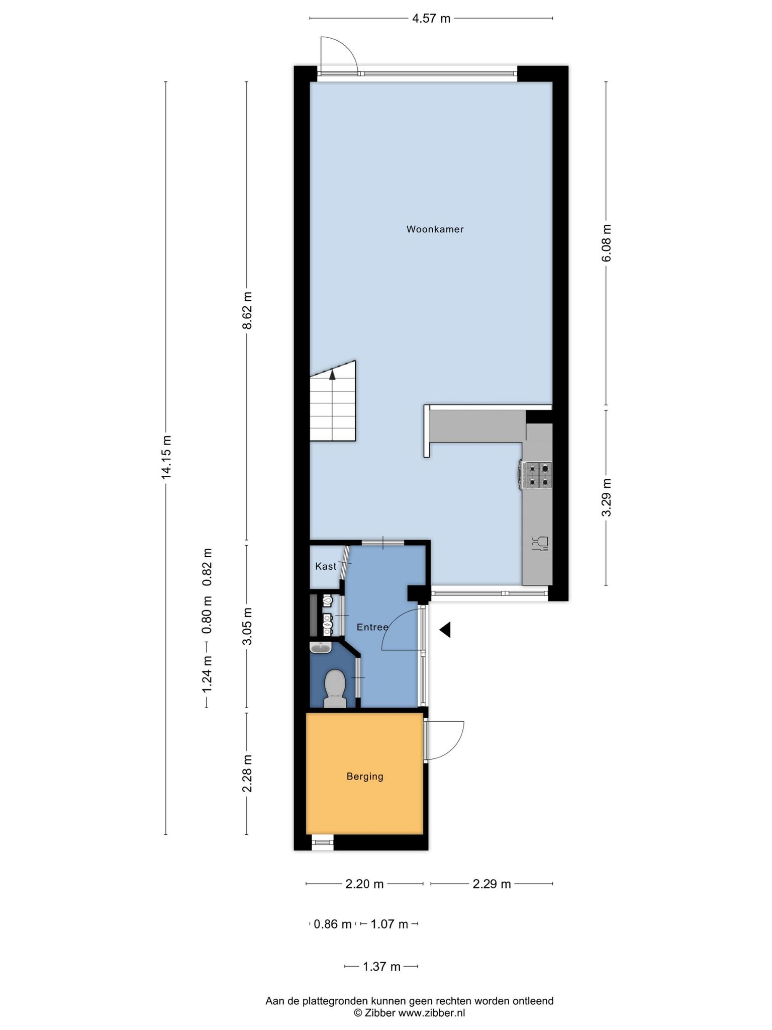 Via de voortuin kom je aan bij de entree van de woning en de aangebouwde stenen berging. De berging is verrassend ruim door de hoogte waar je met gemak een vliering in kan maken. Via de entree kom je in de ruime hal met toiletruimte, meterkast en een bergkast. De toiletruimte is voorzien van een staande pot en een fontein.