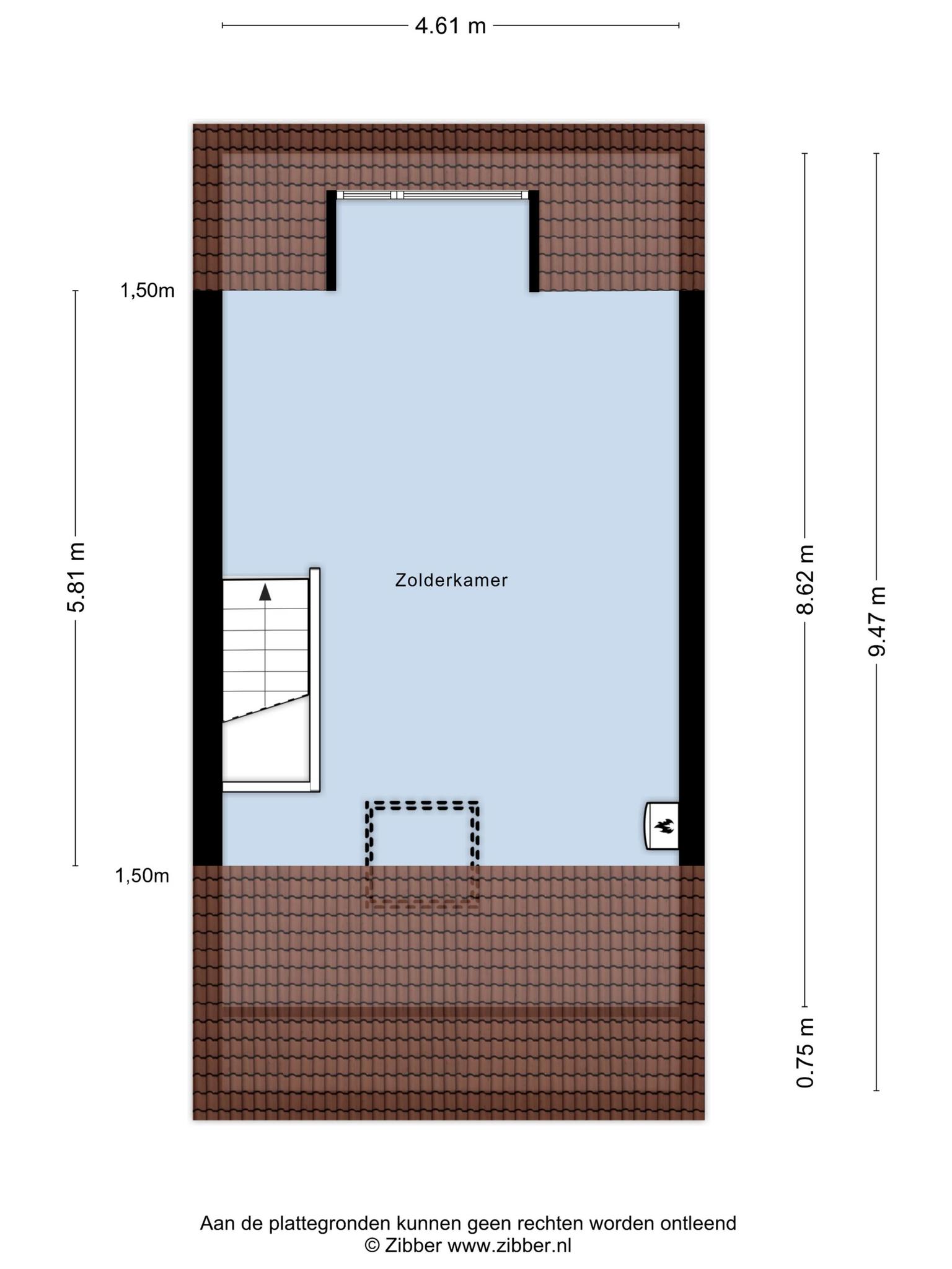 Via een vaste trap is er toegang tot de zolderverdieping. De zolderverdieping is een fijne lichte ruimte door het dakraam en de dakkapel. Daarnaast voelt de zolder extra ruim aan door de hoge nok van 3.65. De zolderverdieping is nu nog 1 open ruimte, maar hier kunnen prima een aparte voorzolder, een vliering en 1 of 2 slaapkamers worden gerealiseerd. Op deze verdieping vind je eveneens de c.v.-ketel (2011).