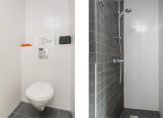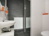 Keurige badkamer volledig betegeld in een kleurstelling wit en antraciet. De badkamer is zeer compleet met douchehoek, wastafel, toilet en aansluiting voor de wasmachine.