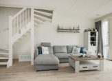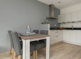 Hal met meterkast en toegang tot de woonkamer. De sfeervolle woonkamer voorzien van laminaatvloer met vloerverwarming. De woonkamer is heerlijk licht door de grote raampartij op het zuidwesten.