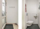 Via een tweede hal komt u bij het toilet en de stookruimte. Een keurig betegeld vrijhangend toilet met handwasbakje. Daarnaast de C.V.-ruimte met CV-ketel van het merk Intergas, de warmte terugwininstallatie en voldoende opbergruimte voor uw extra voorraad/schoonmaakspullen.