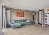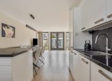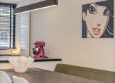 Aan het einde van de hal loop je de woonkamer met open keuken in. Met een aanbouw aan de achterzijde is er meer ruimte dan verwacht en ramen tot vloerhoogte zorgen, net als de openslaande deuren, voor heerlijk veel lichtinval. Mooie details zijn de hoge wandradiatoren, witte plinten, de open kast aan de keukenzijde en de zwarte schuifdeur met glas.