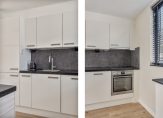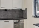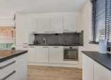 In de ruime keuken is de ruimte fraai ingedeeld met een lang kook- en spoelgedeelte, een tweede wandopstelling bij het raam en het eiland dat grenst aan het eetgedeelte. De vele kasten en lades bieden veel bergruimte en alle benodigde apparatuur (2015) is ingebouwd: een inductie kookplaat, afzuigkap, vaatwasser, oven en een koel-/vriescombinatie. Ook hier zijn de muren gestuct en hierna geschilderd in een mooie kleurstelling.