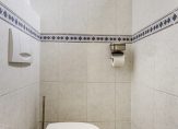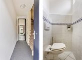 Open de blauwe voordeur naar de lange hal, met de trapopgang en een handige trapkast aan de rechterzijde. Op de trap ligt tapijt en de lambrisering is, net als de muren en het plafond, in een lichte kleur geschilderd. Welke kleur geef jij aan deze ruimte? De nette toiletruimte met wandcloset en grote, lichte tegels heeft een raampje in de voorgevel.