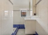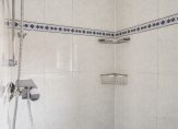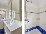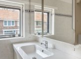 De L-vormige badkamer met raam in de voorgevel is ingedeeld met een ruime douche, wastafelmeubel en een spiegelkast. Qua ruimte is het mogelijk om de naastgelegen inbouwkast samen te voegen met de badkamer, waardoor het plaatsen van een toilet mogelijk is. Hiervoor dienen de benodigde aansluitingen nog gerealiseerd te worden. Voor de wasmachine en droger is er een tweede inbouwkast, te bereiken vanaf de overloop.