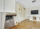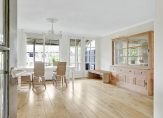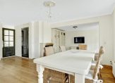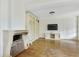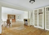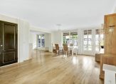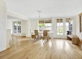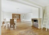 Aan de achterzijde, over de hele breedte van het huis, is de ruime L-vormige woon-/eetkamer. Oorspronkelijk was de woonkamer bijna 5.20 meter breed, maar een groot deel van de garage is toegevoegd aan de leefruimte waardoor de breedte nu maar liefst 8.70 meter is. Sfeermakers zijn de eikenhouten vloer en de klassieke schouw met open haard, tussen het zit- en het eetgedeelte. Grote ramen en dubbele openslaande deuren geven toegang tot het overdekte terras (veranda) en de ruime tuin aan de achterzijde.