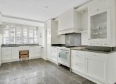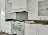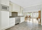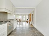 De open keuken, met een mooie tegelvloer, bevindt zich aan de voorzijde. Ook hier zorgen grote ramen voor lichtinval en de keukenopstelling, in een L-vorm, past met de modern landelijk stijl perfect bij het huis. Blikvanger is het grote gasfornuis met oven en verder zijn er een afzuigkap, magnetron, koelkast en een vaatwasser ingebouwd.