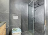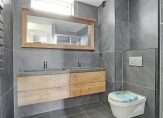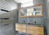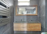 De moderne badkamer, met grote grijze tegels op de muren en vloer, is ingedeeld met een inloopdouche, wandcloset en een dubbel wastafelmeubel. Het raam zorgt ervoor dat de badkamer dat er daglicht en natuurlijk ventilatie heeft.