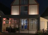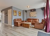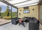 Zaangerichte living met fraaie metselwand voor larger than life screen en apparatuur. Brede haard op (flessen-) gas, bedienbaar via app en afstandsbediening. Dubbele openslaande deuren naar aangebouwde in hoogwaardig aluminium opgetrokken en degelijke onderheide serre met casco betonvloer. Volledig te openen met schuifpuien en voorzien van infrarood heaters. Deze gehele woonlaag is, inclusief de serre, eveneens voorzien van airco.