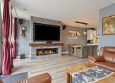 De keramische vloer vormt de warmtebron op alle verdiepingen, dus ook hier op de begane grond. Echter, de lichte en Zaangerichte living werd bekroond met een gemetselde voorzetwand waarin zowel een ongekend groot scherm als een brede haard zijn geplaatst. De laatstgenoemde wordt gevoed met gas via een ingenieus gesloten systeem, waarbij de haard gevoed wordt uit flessen, de warmte zich verspreid en de reststoffen automatisch worden afgevoerd. Met een app kan worden bepaald in welke mate en tempo de vlammetjes mogen dansen. Met dezelfde mobiel kunnen overigens ook alle lichten in en om de villa worden bediend.