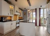 Riante leefkeuken met geprofileerd granieten werkbladen in dubbele opstelling met dito spoeleiland. Dubbele verzonken rvs spoelbakken met Quooker en food disposer. Ingebouwde vaatwasser. Kookgedeelte met Smeg inductiefornuis plus met plasmafilter uitgeruste wasemkap in schouw. Rustieke, op maat gemaakte servieskasten en brede laden. Magnetron. Amerikaanse koelkast met aparte wateraansluiting. Tweemaal openslaande draai- en kiepdeuren op het oosten (ochtendzon).