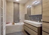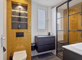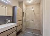 Met dezelfde voortvarendheid als de begane grond en buitenruimte zijn de bovenste woonlagen verrijkt met ruimte en comfort. De in totaal vijf slaapkamers zijn, zoals eerder aangegeven, uitgerust met zowel vloerverwarming en airco als de domotica om dit individueel te bedienen. Zowel op de eerste als tweede verdieping zijn royale en comfortabele badkamers gerealiseerd. Op de eerste verdieping werd de toiletruimte apart geplaatst en is de badkamer uitgevoerd met een ligbad, ruime inloopdouche en dubbele wastafels. Een etage hoger vinden we ook weer handgemaakte Mexicaanse wandtegels, een warme omlijsting voor het comfort van de grote inloopdouche en derde toilet.