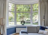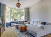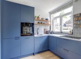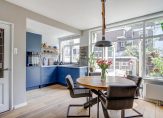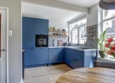 Blauw is de kleur die je niet alleen in de woonkamer ziet, maar ook als subtiel detail in het glas in lood en in de keuken. De keukenopstelling, met een blad van wit composiet en mooie wandtegels, is voorzien van diverse inbouwapparatuur: een Bora inductie kookplaat met geïntegreerde afzuiging, een vaatwasser, oven en een koel-/vriescombinatie.