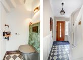 De eerste indruk is fantastisch; een typische jaren 30 gevel met een erker, balkon en een prachtige entree. Achter de klassieke, hardhouten voordeur is de hal met de trapopgang, paneeldeuren met recent vernieuwd glas in lood, een lambrisering en een mooie, karakteristieke tegelvloer. Onder de trap is een bergkast en de naastgelegen, stijlvolle toiletruimte is ingedeeld met een wandcloset en fonteintje.