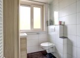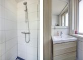 De badkamer, uitgevoerd in rustige kleuren, is voorzien van een inloopdouche, wastafelmeubel en toilet. Er is lichtinval, maar toch privacy, en de mechanische ventilatie zorgt dat de badkamer altijd geventileerd kan worden.
