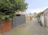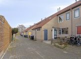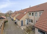 Het is een autovrij straatje, dus je kunt ongehinderd de buitenkant van deze woning bewonderen. Bij de overkapping is de voordeur, die toegang geeft tot de hal. De andere buitendeur, in een grijze kleur, geeft toegang tot een handige (fietsen)berging met vliering.