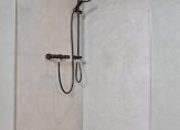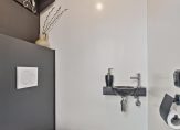 In 2018 is de badkamer uitgebouwd en geheel vernieuwd. Op de muren zie je grijs betonstuc en het dakraam zorgt voor veel lichtinval. De ruimte is ingedeeld met een ligbad, inloopdouche, wandcloset en een groot wastafelmeubel.