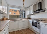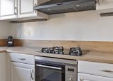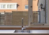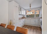 Via het eetgedeelte loop je de keuken in, waar een lichte U-opstelling staat. Als je het aantal kasten en lades telt, is de conclusie dat er veel bergruimte is. De gaskookplaat, afzuigkap, combimagnetron, vaatwasser, koelkast en vriezer zijn ingebouwd.