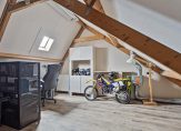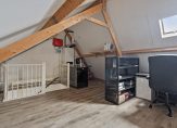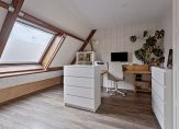 Een vaste trap geeft toegang tot een grote, multifunctionele kamer met een uitzetraam aan de achterzijde. De houten dakconstructie is zichtbaar en er ligt, net als op de eerste verdieping, laminaat op de vloer. Naast de trap is de wasmachineaansluiting en de rest van deze verdieping is te gebruiken als slaapkamer, werkkamer en/of hobbyruimte.