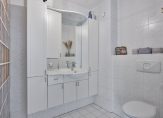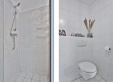 De badkamer, origineel van het bouwjaar van het huis, is ingedeeld met een inloopdouche, wandcloset en een groot wastafelmeubel. Zowel de wanden als de vloer zijn in een lichte kleur betegeld.