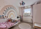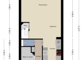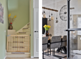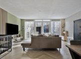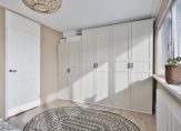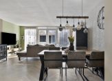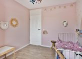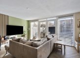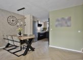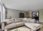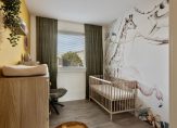 Via de woonkamer loop je de uitgebouwde woonkamer in, die het toonbeeld van sfeer is. Mooie, zachte kleuren op de muren passen goed bij de visgraatvloer en de pui met openslaande deuren zorgt voor veel lichtinval. Voor een grote zithoek, tv-meubel, eettafel en een babybox is genoeg ruimte in deze woonkamer.