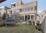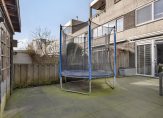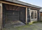 In de voortuin is aan drie kanten een houten omheining geplaatst. Hout is ook gebruikt als erfafscheiding in de achtertuin, gesitueerd op het zuiden. Verder zie je grote betontegels en een ruime (fietsen)berging met overdekt terras. Links in de tuin is een poort naar de brede steeg, waardoor je zo met de fiets op pad kunt.