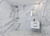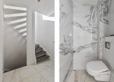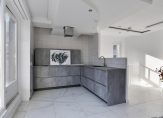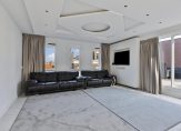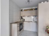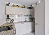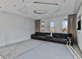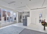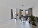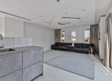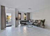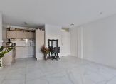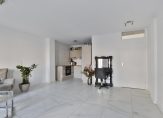 Bereik via de trap de tweede verdieping, waar de tweede ruime woonkamer met open keuken wacht. De keuken is gloednieuw (2024). De woonkamer heeft de zelfde prachtige tegels als de andere verdiepingen (en is dus ook voorzien van vloerverwarming!), een gestuukt plafond met spotjes.
