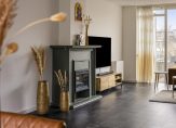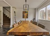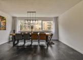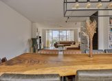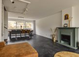 Op de eerste verdieping is de ruime woon-/eetkamer, met grote ramen aan de voor- en achterzijde. Er ligt dezelfde vloer als op de begane grond, de wanden zijn in 2020 nog gestuukt en de grote ramen aan de voor- en achterzijde zorgen gedurende een groot deel van de dag voor fijne lichtinval. Bij het zitgedeelte is een groene schouw met sierhaard geplaatst en het eetgedeelte biedt ruimte aan een grote tafel; perfect voor een etentje met vrienden en familie.