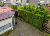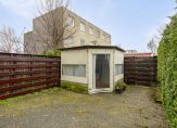 De keuken grenst aan de achtertuin, gesitueerd op het zuidwesten. Hier is een overkapping gebouwd, met zijwanden van zeil, waardoor je spullen droog kunt opbergen. Verder is de tuin grotendeels bestraat en hangt er een breed zonnescherm tegen de achtergevel. Er is een poort naar de steeg en houten schuttingen vormen een mooie erfafscheiding.