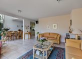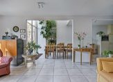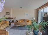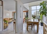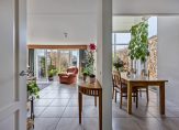 Aan de tuinzijde, met grote ramen aan de zuidwestkant, bevindt zich de speels ingedeelde woon-/eetkamer. In de woonkamer en de gang ligt er vloerverwarming. Het eetgedeelte met vide is een fijne plek om te eten en het royale zitgedeelte heeft openslaande deuren naar de tuin. De schouw bij het zitgedeelte is nog zichtbaar, maar niet meer in gebruik, en onder de trap is een handige bergkast.