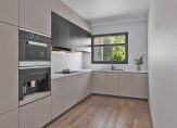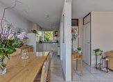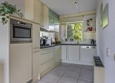 In het verlengde van het eetgedeelte is de ruime, open keuken met uitzicht naar het groen in de voortuin. De lichte hoekopstelling met apothekerskast en hoge bovenkasten biedt veel bergruimte en het aanrechtblad is gemaakt van zwart natuursteen. Alle apparatuur is ingebouwd: een gaskookplaat, afzuigkap, vaatwasser, combi-oven en een koelkast.