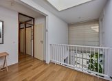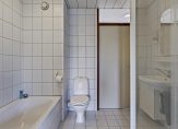 De overloop en master bedroom hebben beiden een deur naar de badkamer. Deze ruimte, met lichte tegels op de wanden en vloer, is ingedeeld met een ligbad, aparte douche, tweede toilet en een wastafel.