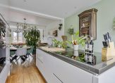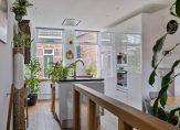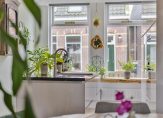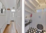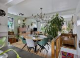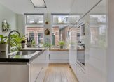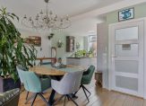 In de hal met veel lichtval heb je de meterkast, trapopgang, de toiletruimte met fonteintje en mooie paneeldeuren. Het hoge plafond zorgt, samen met het raam boven de voordeur, dat de hal nog ruimer oogt. De aansluitende woon-/eetkamer is, dankzij de aanbouw, van goed formaat. Grote ramen zorgen aan twee zijden zorgen voor veel lichtinval en er ligt, net als in de hal en keuken, een fraaie eikenhouten vloer.