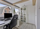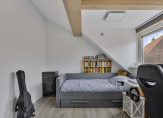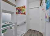 De ramen in de zijgevel zorgen ervoor dat de overloop en trapopgang heel veel lichtval hebben. De houten dakconstructie is op de hele verdieping zichtbaar, wat zorgt voor een huis met karakter.