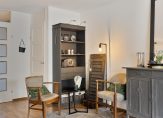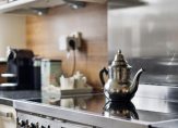 At the front is the open kitchen, where space is optimally used. The countertops are made of black granite and the wood-look back wall fits well into the look. The induction stove with wide oven, extractor hood, dishwasher and refrigerator are ready for a new kitchen prince(s).
