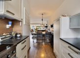 Aan de voorzijde is de open keuken, waar de ruimte optimaal is benut. De aanrechtbladen zijn van zwart graniet en de houtlook achterwand past goed in het geheel. Het inductie fornuis met brede oven, de afzuigkap, vaatwasser en koelkast staan klaar voor een nieuwe keukenprins(es).