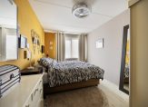 Ruimte is er ook op de eerste verdieping, waar drie slaapkamers en de badkamer zijn. In de slaapkamer aan de voorzijde, ingericht als werkkamer/hobbyruimte, staat een vaste kastenwand en een van de slaapkamers aan de achterzijde is de master bedroom, te herkennen aan de prachtige kleur geel op de muur achter het bed.