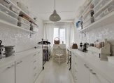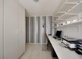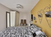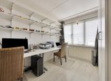 There is also a lot of space on the first floor, where there are three bedrooms and the bathroom. The bedroom at the front, which is furnished as an office/hobby room, has a fixed cupboard wall and one of the bedrooms at the rear is the master bedroom, recognizable by the beautiful yellow color on the wall behind the bed.