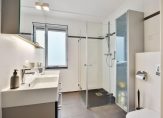 De badkamer heeft, heel prettig, een groot raam waardoor veel licht naar binnen valt. Verder zie je witte wandtegels met een zwarte tegelrand, gecombineerd met grijze vloertegels van formaat. De ruimte is ingedeeld met een ruime douche, dubbel wastafelmeubel, spiegelkast, wandcloset en een hoge wandkast.