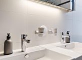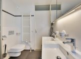 The bathroom has a very nice large window that lets in a lot of light. You will also see white wall tiles with a black tile edge, combined with large gray floor tiles. The room is divided into a spacious shower, double washbasin, mirror cabinet, wall-mounted toilet and a high wall cabinet.