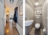 Nu we het toch over de hal hebben, deze is lekker ruim en heel sfeervol. Op de muren zie je behang, de bruine laminaatvloer ligt op bijna de hele begane grond en het tapijt op de trap past goed in het geheel. Links in de hal, naast de trap, is de toiletruimte met betonstuc en stijlvol, wit sanitair.