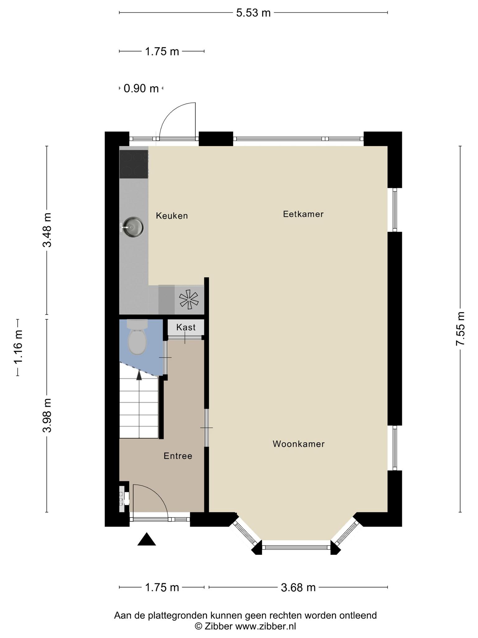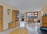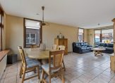 De woonkamer heeft, omdat het een hoekwoning is, lichtinval via grote ramen aan drie zijden. ’s Ochtends is er de zon bij het achterraam, de zijramen zijn op het zuiden en de avondzon valt via de erker naar binnen. Het zitgedeelte is aan de voorzijde, bij de erker, en het eetgedeelte grenst aan de keuken.
