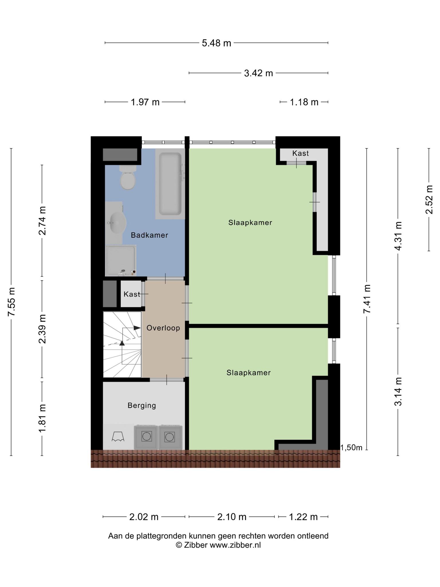 Vanaf de overloop zijn twee ruime slaapkamers, de badkamer, een berging/wasruimte en een inbouwkast te bereiken. De badkamer, gerealiseerd in een voormalige slaapkamer, is ingedeeld met een ligbad, aparte douche, toilet en een wastafelmeubel. De hoofdslaapkamer heeft, net als de slaapkamer aan de voorzijde, grote ramen aan twee zijden en laminaat op de vloer. Vanuit beide slaapkamers heb je mooi uitzicht naar de Karl Marxstraat waar meerdere woningen recentelijk zijn gerenoveerd.