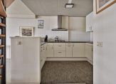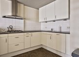 De halfopen keuken is een ruimte van goed formaat, waar een nette U-opstelling staat. Deze keuken biedt veel bergruimte en de gaskookplaat, afzuigkap, vaatwasser, koelkast en vrieskast zijn ingebouwd.