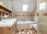 1e Verdieping: overloop – drie slaapkamers, waarvan de ouderslaapkamer met wastafel – badkamer ingedeeld met een ligbad met whirlpool, ruime douchehoek, toilet en wastafelmeubel met dubbele wastafel.