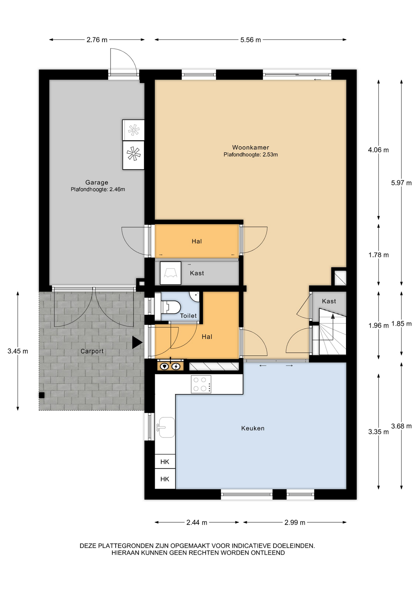 Begane grond: entree/ hal – meterkast- toilet met fonteintje – woonkamer met provisiekast en schuifpui naar de tuin – ensuite deuren naar de woonkeuken – bijkeuken met wasmachine-/ drogeraansluiting en vaste kast – deur naar de garage.