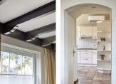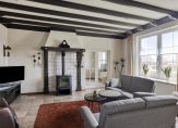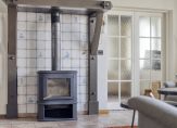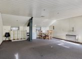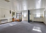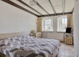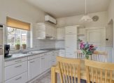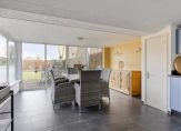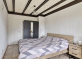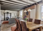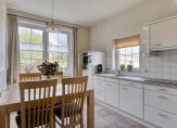 Ook de woonkeuken is direct vanuit de berging toegankelijk. Deze woonkeuken heeft nette lichte keukenopstelling met vaatwasser, combi oven/magnetron, inductiekookplaat en koelkast. Het aanrecht is afgewerkt met een mooi terrazzoblad. In de keuken ligt een tegelvloer, welke doorloopt naar de woonkamer. Dit is een royale leefruimte met voldoende plek voor een grote eethoek en zithoek. In de woonkamer is een schouw met houtkachel. Er zijn openslaande deuren naar een extra kamer op de begane grond, welke momenteel als slaapkamer in gebruik is. Deze kamer kan echter ook prima dienst doen als werk- of speelkamer. Aansluitend is ook een badkamer gemaakt met ligbad, inloopdouche en wastafel met meubel.