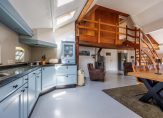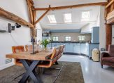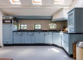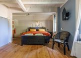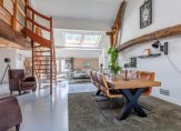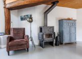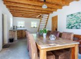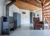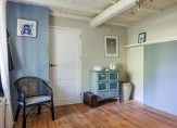 Entree, meterkast, vaste kastruimte en toegang tot 2 slaapkamers. De royale ouderslaapkamer is 27 m² groot en voorzien van vaste kastenwand en badmeubel. De 2e slaapkamer is 16 m² groot en heeft 2 vaste kastruimtes waar vroeger de bedstee in was gesitueerd. Vervolgens komt u in een ruime tussenhal welke vanaf de zijgevel ook de dagelijkse ingang vormt. Vanuit deze hal zijn de toiletruimte, badkamer en woonkamer toegankelijk. De badkamer is ca. 12 jaar geleden vernieuwd en de toiletruimte ca. 4 jaar geleden. De woonkamer en keuken vormen het speelse middelpunt van de boerderij. Het is een sfeervolle open ruimte met vide waarbij diverse extra dakramen zorgen voor veel daglichttoetreding maar waar ook oude elementen zichtbaar zijn gebleven zoals de houten gebinten. Deze ruimte is totaal ca. 75 m² groot en ingedeeld met speelse hoekjes en dubbele openslaande tuindeuren zodat u lekker in de tuin kunt wegkijken. Ook is hier de trapopgang naar de verdieping. De keukeninrichting is in 2021 gerenoveerd en de landelijke uitstraling past perfect in het geheel. Er zijn diverse inbouwapparatuur zoals een oven, afzuigkap, inductiekookplaat, koelkast, vaatwasser en Quooker. Ook zijn er 2 houtkachels aanwezig naast de reguliere verwarming. Vanuit de keuken komt u in de berging waar de combiketel hangt voor warm water en de radiatoren in het voorhuis en waar de wasmachine is opgesteld. Vervolgens is er nog een 2e ruime praktische bijkeuken met de opstelling van de heteluchtverwarmingsinstallatie (voor het woonkamerdeel).