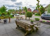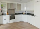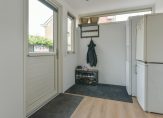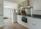 Aan de achterzijde loopt de woonkamer over in de keuken, opgesteld in een L-vorm. Je vindt hier diverse inbouwapparatuur zoals een koel-/vriescombinatie, vaatwasser, combimagnetron, gaskookplaat en een Quooker met kokend en bruisend water (ter overname). Aansluitend bevindt zich de bijkeuken met volop ruimte voor een garderobe en extra apparatuur. Vanuit hier stap je zo de achtertuin in – perfect voor je eerste kop koffie in de ochtendzon.