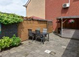 – Diepe achtertuin met stenen berging, overkapping en praktische achterom
